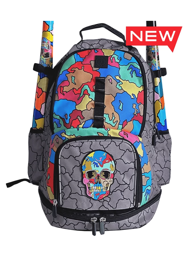 Crack skull Bat Bag, The perfect bag for the field..incredibly spacious it can fit all your gear, extra accessory pockets including designated pockets for cleats and your helmet! Two strap in bat pockets & a hanging clip to hang your bag on any chain link fence for convenience .